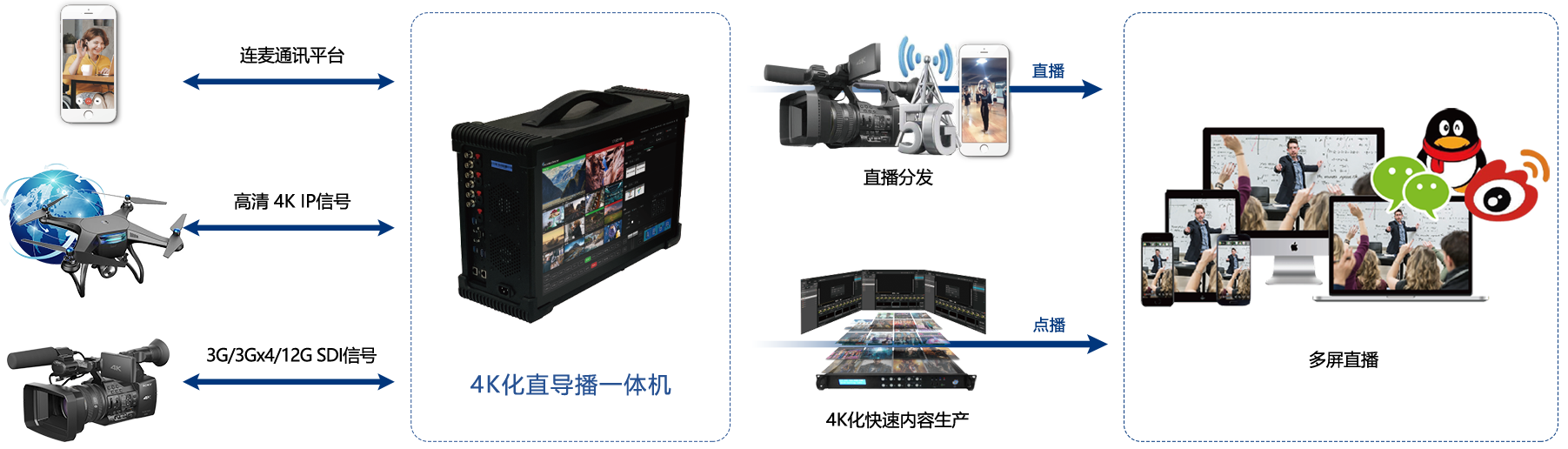 通过海比直播平台账号,打通手机、直导播一体机、云平台以及内容生产系统,全链路无缝对接,加速直播发布与内容生产。