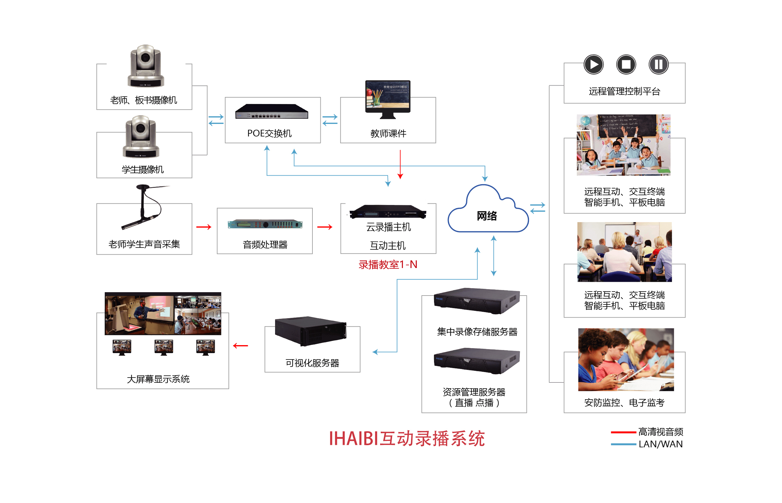 采用嵌入式Linux设计,录播系统采用集直播、点播、智能导播、课件录制、互动、存储等多功能于一体的多用途多功能嵌入式设备,只需要一台录播主机既可解决所有录播问题。